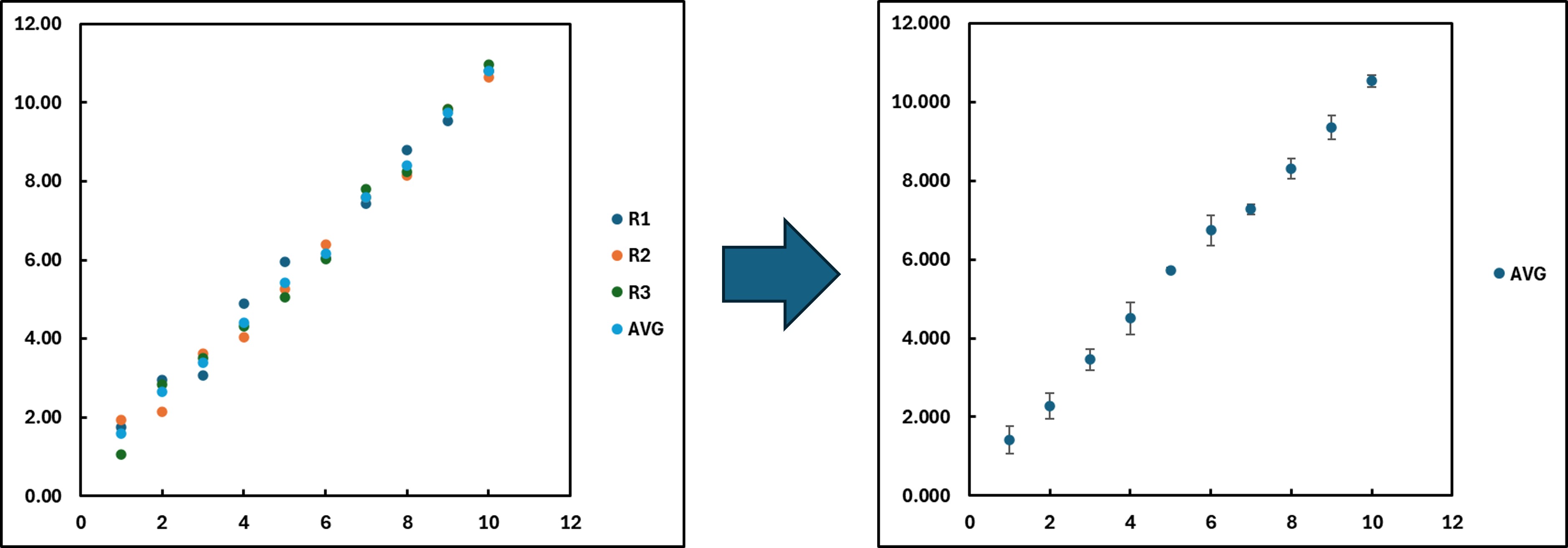 해당 데이터 (R1, R2, R3 및 AVG)를 가지고 엑셀에서 아래와 같은 분산형 그래프를 그릴 수 있다.